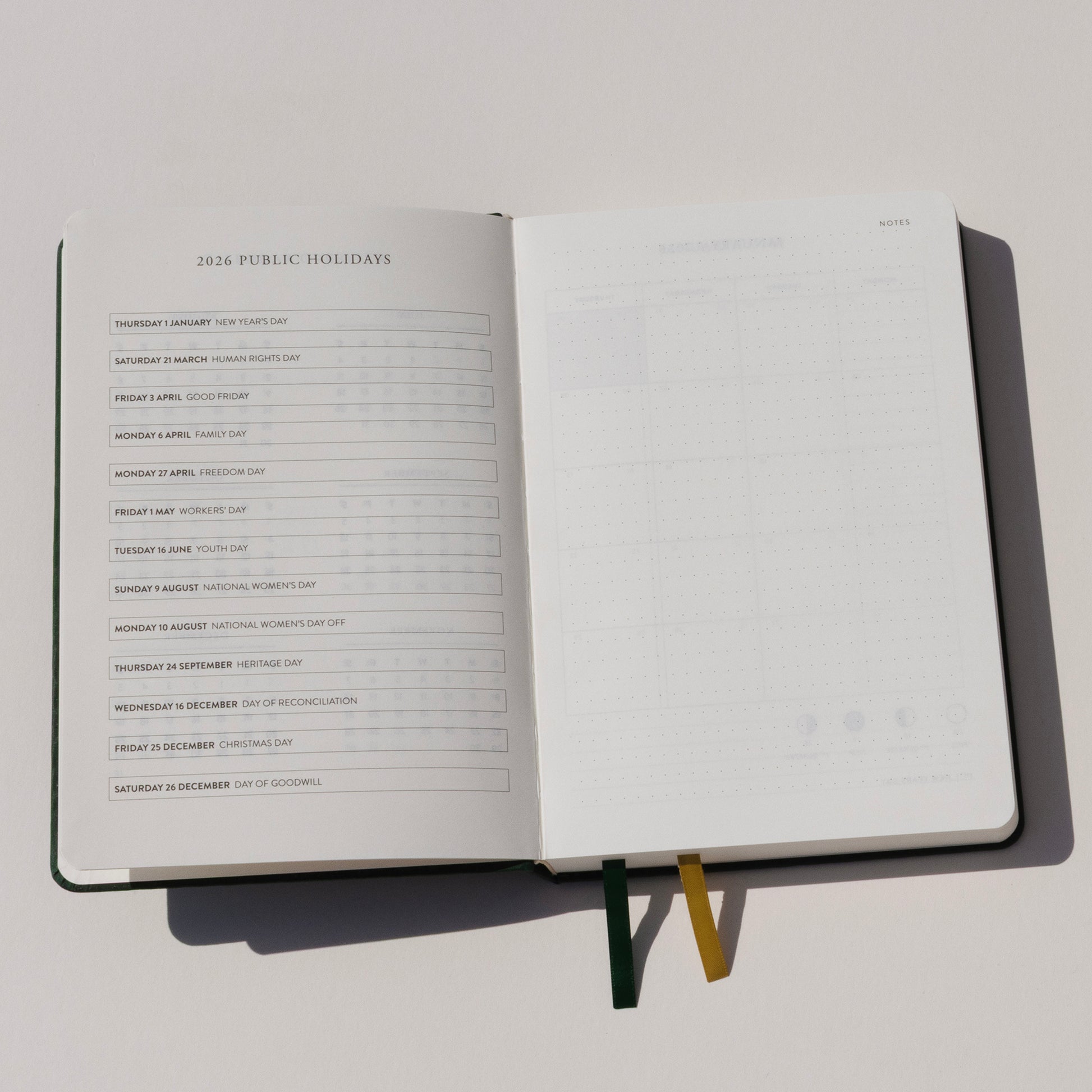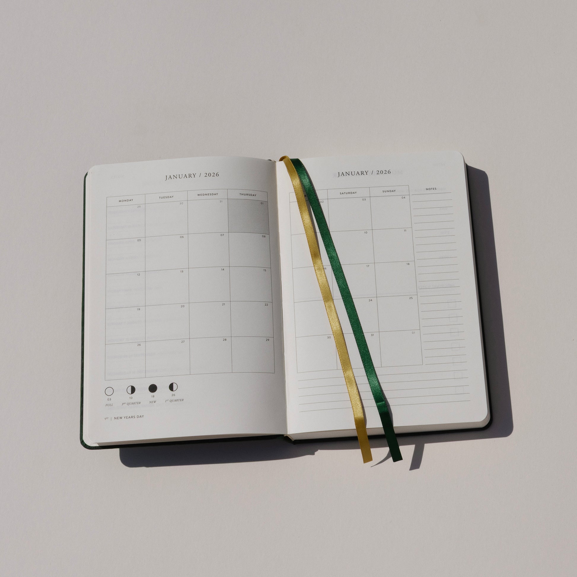 This custom-designed A5 planner was created to carry you through the year of the Fire Horse, 2026. Inside, you’ll find a dotted page-per-day layout with thoughtful inserts for appointments, monthly overviews, and plenty of space to dream and plan. Each month begins with a full double-page spread for clarity at a glance, alongside moon cycles, public holidays, and special days to keep you aligned.